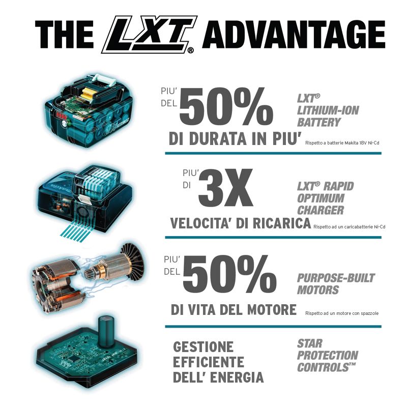 Prima di ricaricare la batteria è necessario raffreddarla perchè dopo l'uso la sua temperatura aumenta. Makita ha sviluppato uno specifico sistema di ricarica che prevede l'uso di una ventola di raffreddamento che in modo efficiente riduce i tempi di attesa per iniziare la ricarica che avviene solo a temperatura idonea. La ventola di raffreddamento è attiva anche durante la ricarica e velocizza il processo di carica.